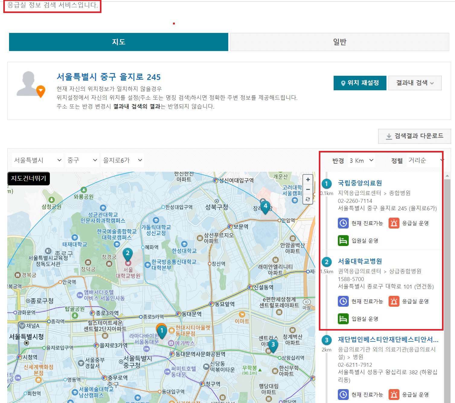 거리순 또는 진료여부으로 조회하는것을 선택할수 있습니다.