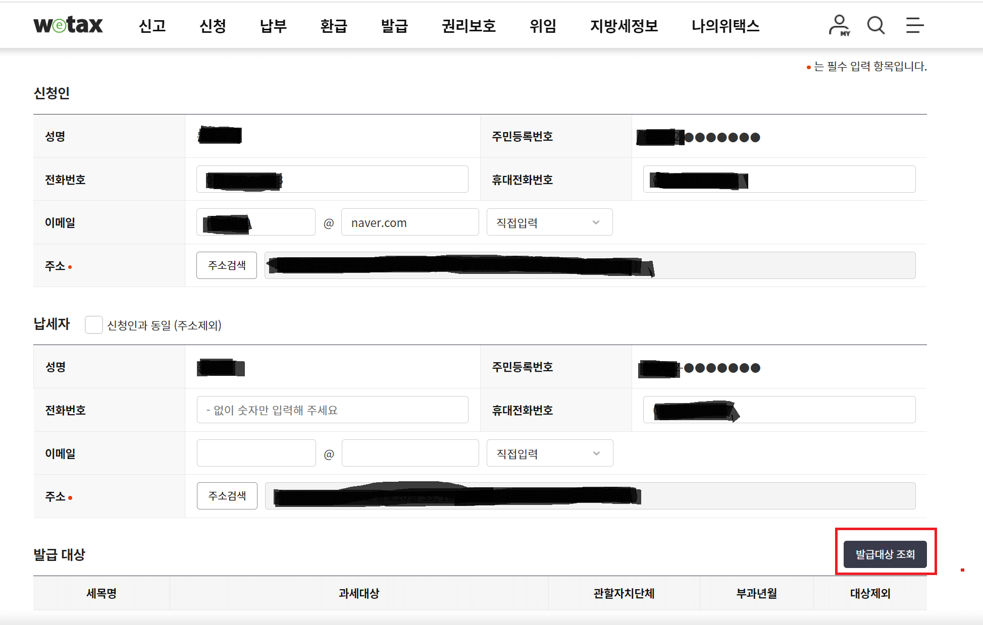 우측 하단에 '발급대상조회'를 클릭합니다.