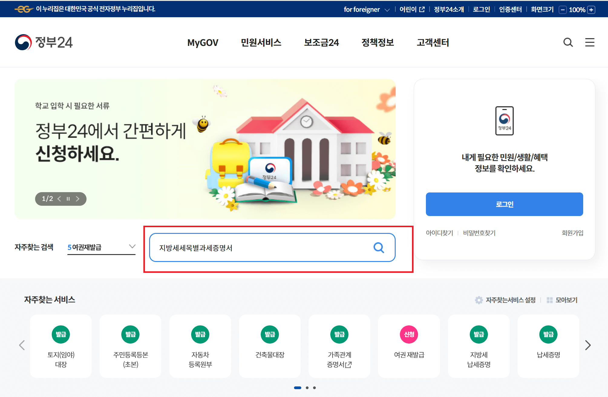 2) 가운데 검색창 부분에 '지방세 세목별 과세증명서'를 입력한 후
