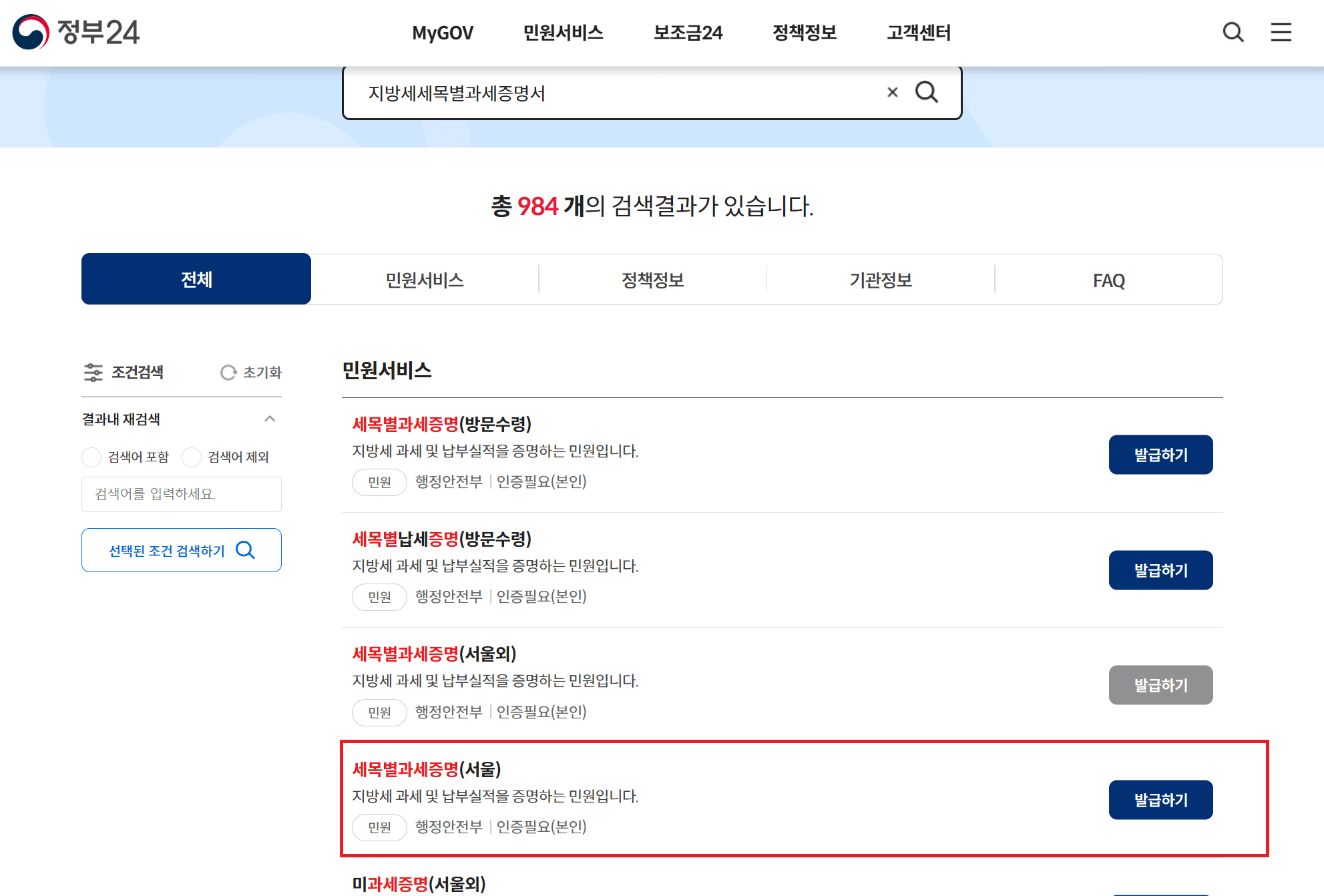 ---> 4번째에 있는 '세목별 과세증명(서울)' 우측에 '발급하기'를 클릭합니다.