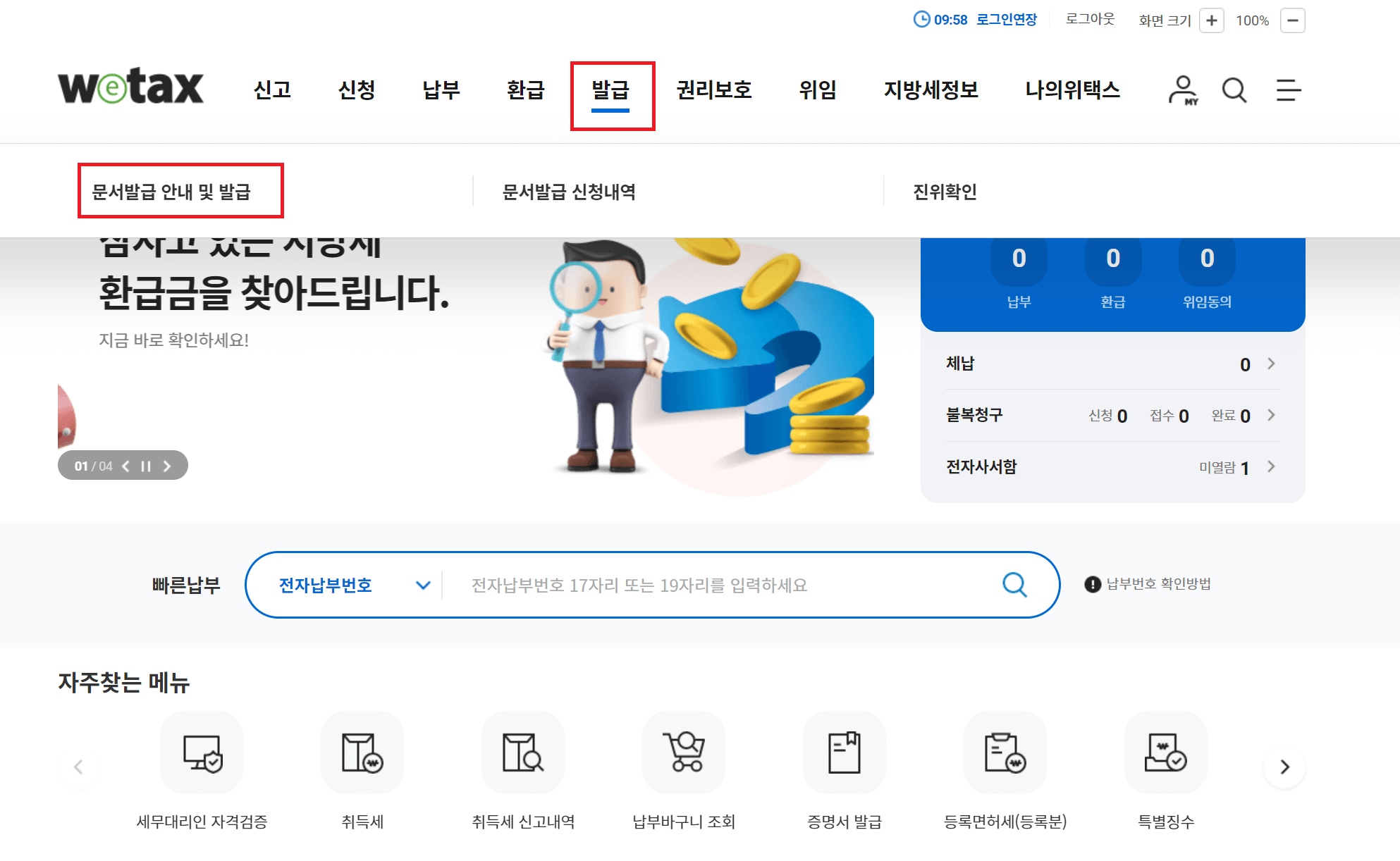하단에 '자주 찾는 메뉴'에서 5번째에 있는 '증명서 발급'을 클릭합니다.