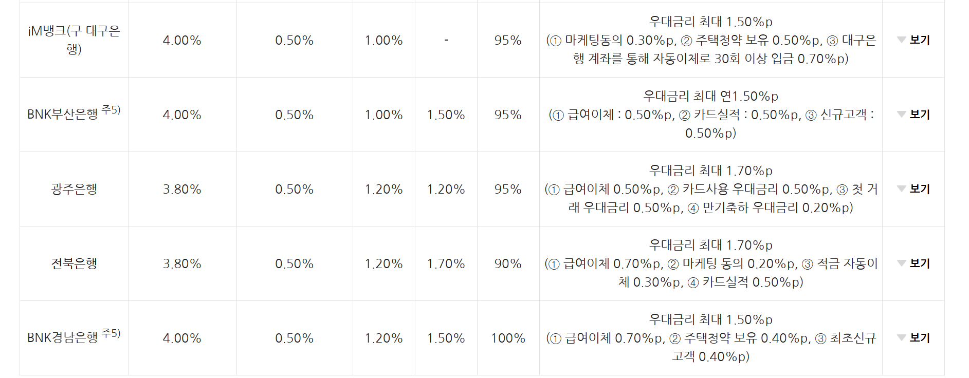 - 은행별로 기본금리는 거의 4.5%로 동일하며, 소득우대금리도 0.5%로 거의 동일합니다.
